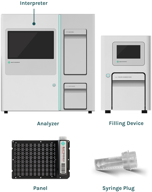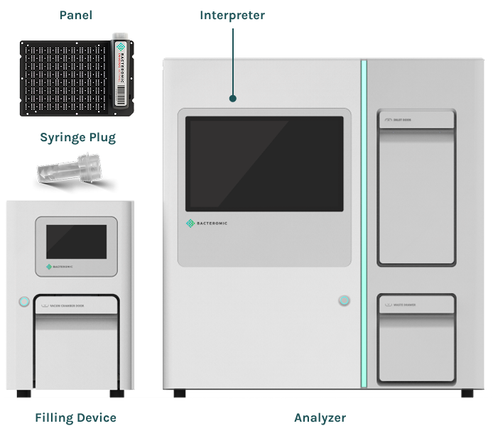 The BACTEROMIC system consists of 3 components (Filling Device, Analyzer, and Interpreter) and is used with BACTEROMIC Panels and accessory BACTEROMIC Syringe Plug. As an automated system, it simplifies and shortens laboratory procedures used in evaluating the drug susceptibility of microorganisms.